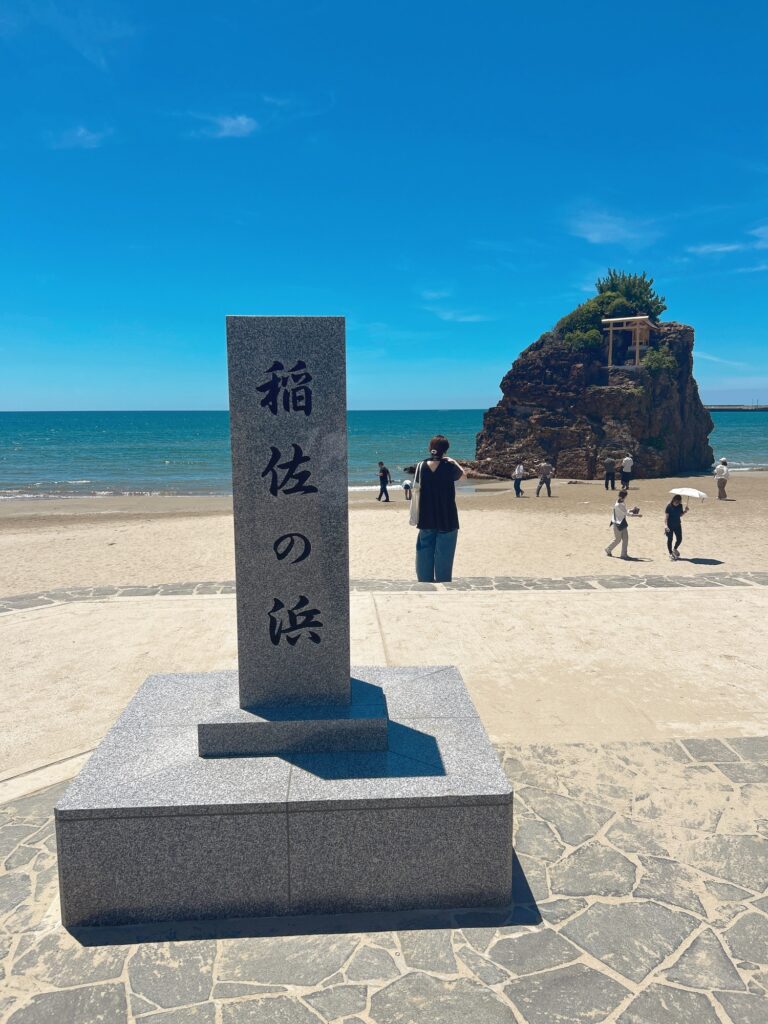 白い砂浜にぽつんと浮かぶ「弁天島」がとても印象的で、空と海の青に溶け込むような風景に、思わず深呼吸したくなるような場所でした。