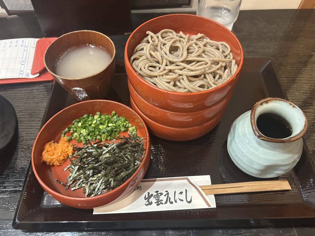 上からそばつゆを回しかけていただくのが出雲流。コシのある黒めのそばに、つゆの風味がよく絡んで、素朴なのに深みのある味わいでした。